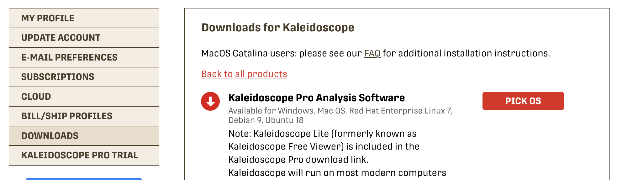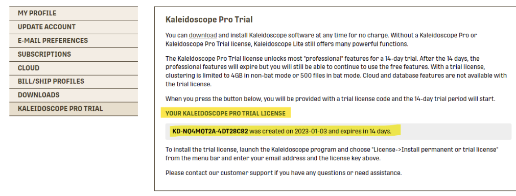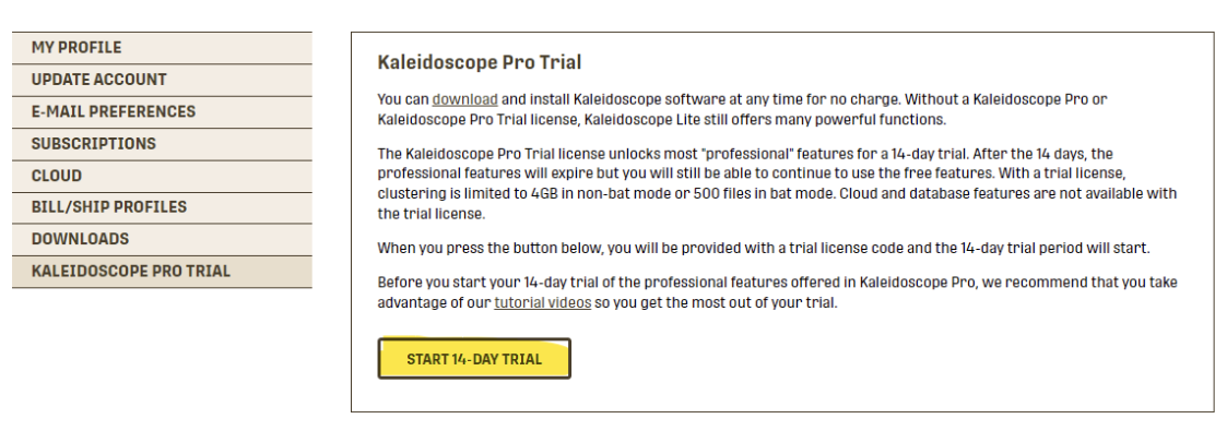In the member portal, select “Kaleidoscope Pro Trial” in the menu on the left. Next, click “Start 14 Day Free Trial”