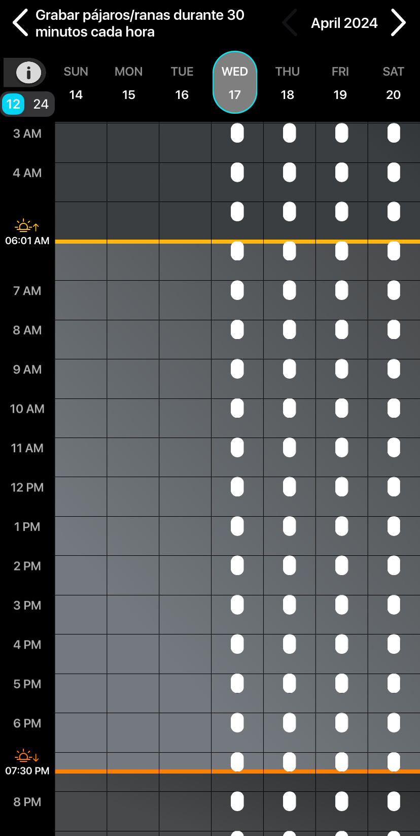 Para especificar si las marcas horarias del eje vertical utilizan el reloj de 12 o 24 horas, pulse el interruptor 12/24 situado sobre el eje horario.
