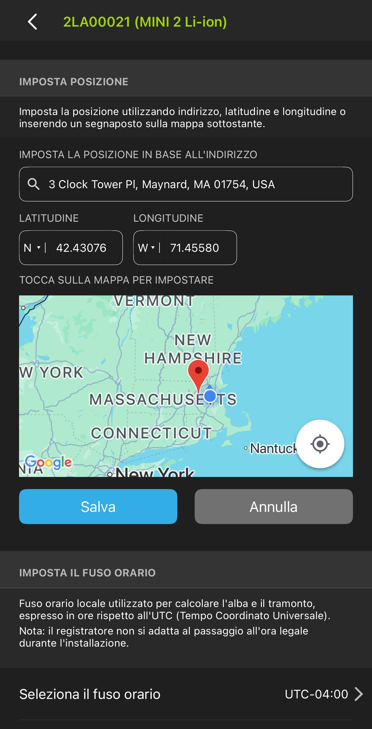 Il luogo e il fuso orario di utilizzo del Song Meter Micro 2 possono essere impostati nella schermata Posizione e fuso orario, accessibile dalla schermata Editor di configurazione.