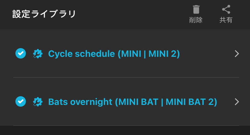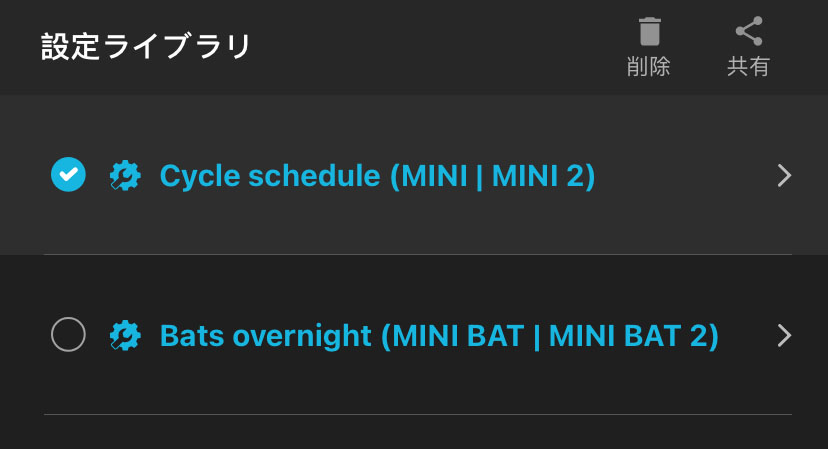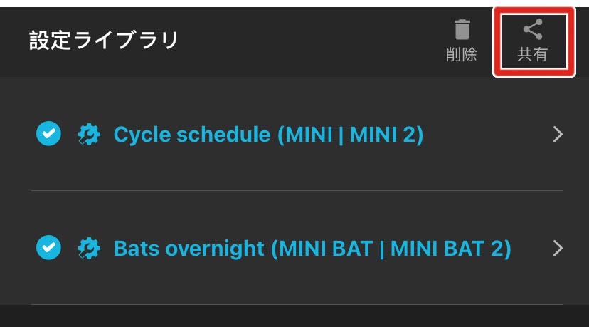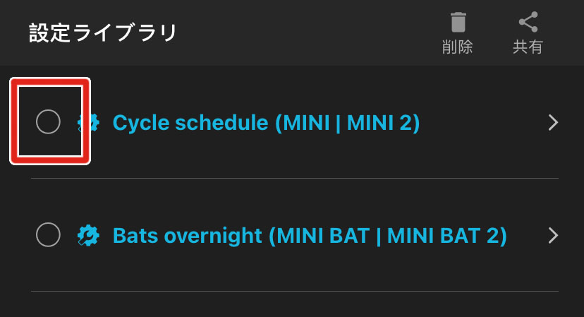 [設定ライブラリ]画面で、任意の設定の左側にある選択円をタップして選択します。